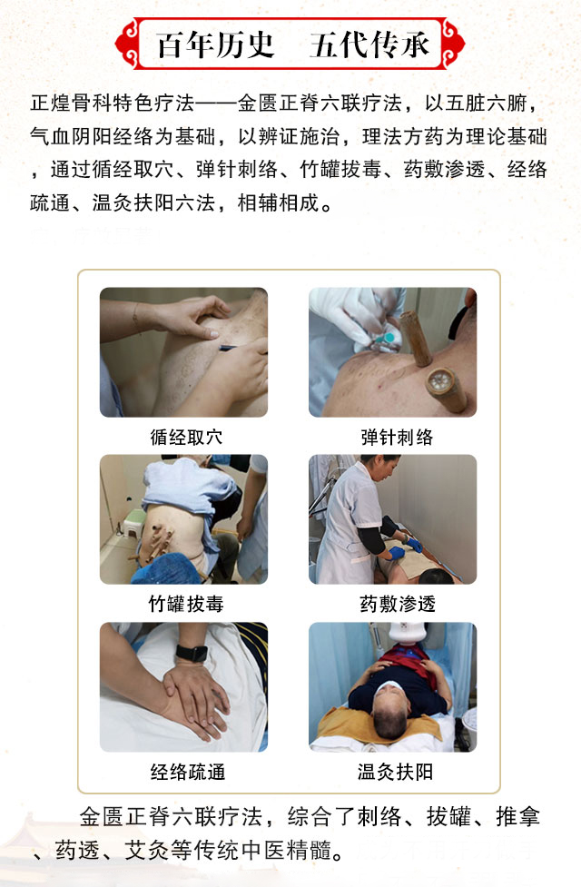 金匱正脊六聯療法源于清朝乾隆皇帝詔令太醫(yī)院院判吳謙,主編的《醫(yī)宗金鑒》中記載的藥竹筒療法,清嘉慶李鳴珂,以此為基礎,創(chuàng)出金匱正脊六聯療法,對治療頸肩腰膝腿痛等癥療效彰著,如今經過五代人的傳承與改進,并經臨床大量病歷驗證,此療法對治療椎管狹窄、椎間盤突出等更安全、更可靠,見效也更快。